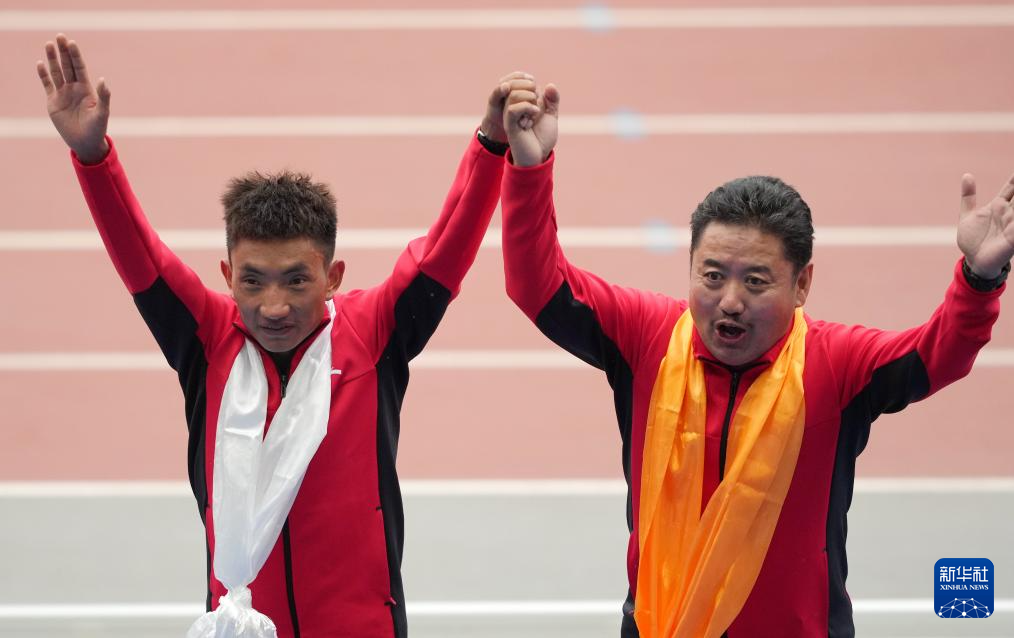 2021年9月23日,西藏隊(duì)選手多布杰(左)在第十四屆全運(yùn)會(huì)田徑項(xiàng)目上,以13分49秒16的成績奪得男子5000米冠軍。圖為他和教練員在頒獎(jiǎng)儀式上。新華社記者 李一博 攝