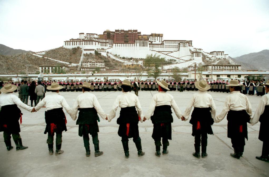 在拉薩市布達(dá)拉宮前,兩位身著藏裝的外國(guó)游客和一位藏族婦女交談。交通和旅游服務(wù)設(shè)施的逐步完善,為獨(dú)具風(fēng)情的西藏高原引來了更多的游客。(1997年11月13日發(fā))