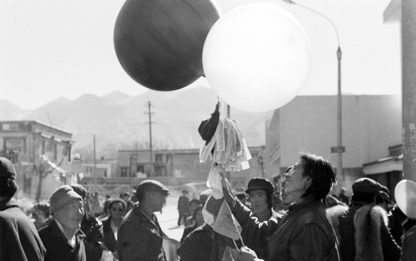 1989年新年伊始,拉薩市街頭出現(xiàn)了賣大氣球的個(gè)體戶,藏族市民喜歡將經(jīng)幡掛在彩色氣球下,放飛空中。