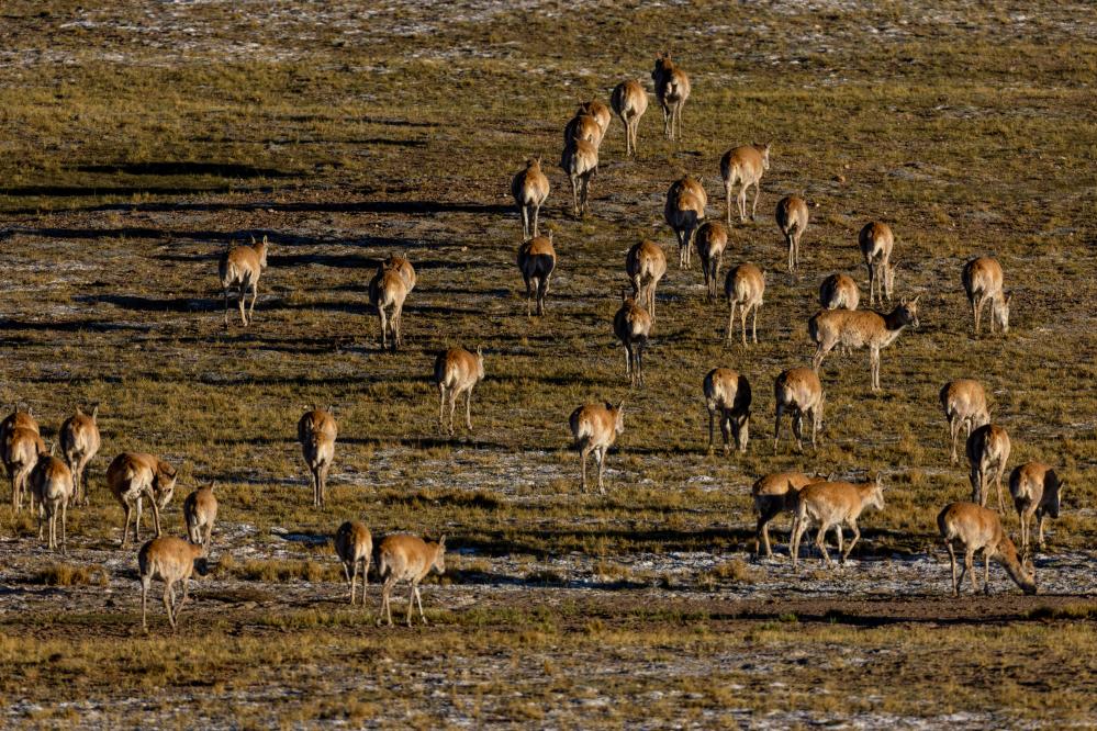 羌塘國(guó)家級(jí)自然保護(hù)區(qū)核心區(qū)繁殖遷徙路上的雌性藏羚羊群。(2025年6月10日攝)。新華社記者 姜帆 攝