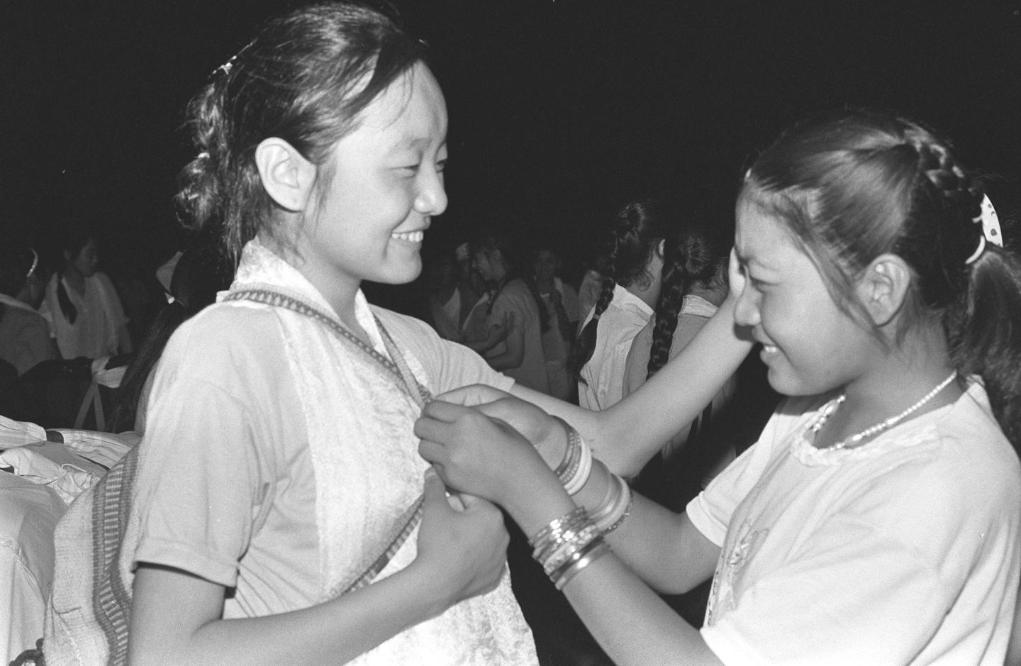 北京西藏中學(xué)首批93名藏族高中畢業(yè)生乘火車離京返藏。1991年入校的次仁卓嘎來到北京火車站為姐姐卓嘎送行。卓嘎是位品學(xué)兼優(yōu)的好學(xué)生。臨別前,她勉勵(lì)妹妹好好學(xué)習(xí)(1992年7月13日攝)。