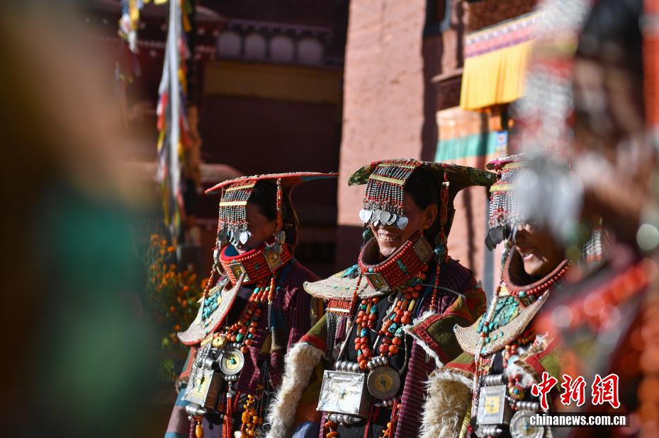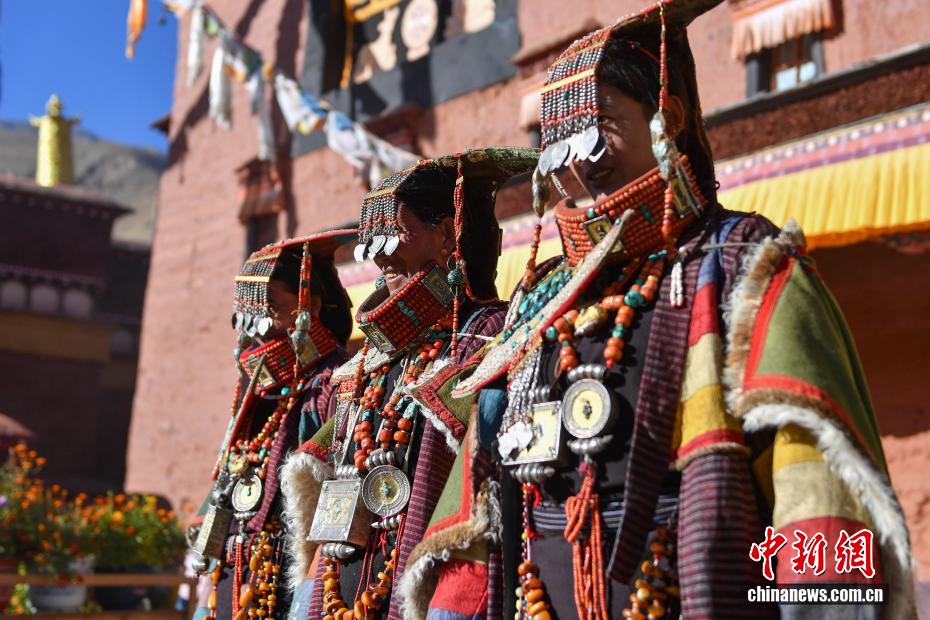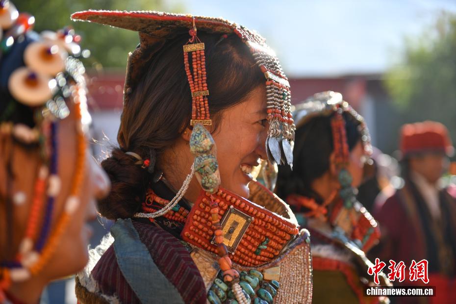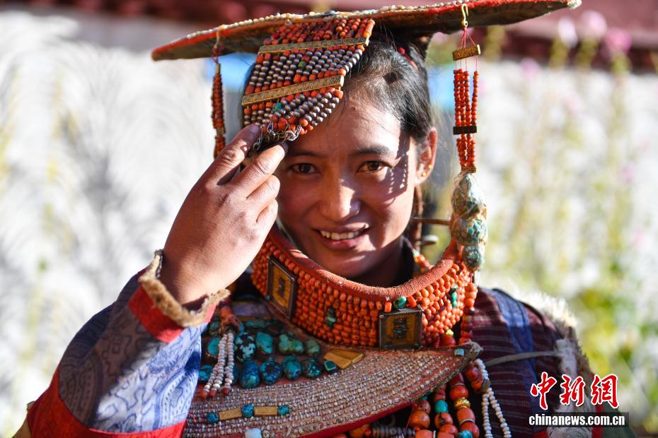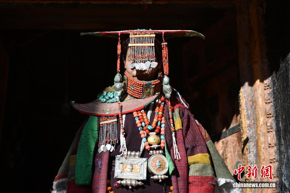 9月23日,西藏自治區(qū)阿里地區(qū)普蘭縣,至今保留著獨特的藏族服飾——普蘭服飾,它是中國國家級非物質(zhì)文化遺產(chǎn)。普蘭服飾已有1000多年的歷史,其中最精美、最獨特的是婦女的“孔雀服飾”,普蘭縣科迦村里有7戶人家保存著7套祖?zhèn)鞣?,一套重達20多公斤,裝飾有黃金、白銀、松石、瑪瑙、珊瑚、珍珠等,承載和沉淀了百年時光,堪稱“穿在身上的千年史”。時至今日,這種美麗的服飾文化還在當?shù)貍鞒兄D為西藏阿里地區(qū)普蘭縣科迦村,村民在展示普蘭服飾。貢確 攝