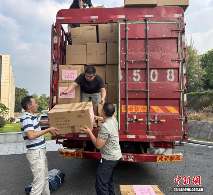 廣州市捐贈(zèng)站工作人員搬運(yùn)物資裝車。廣州市民政局 供圖