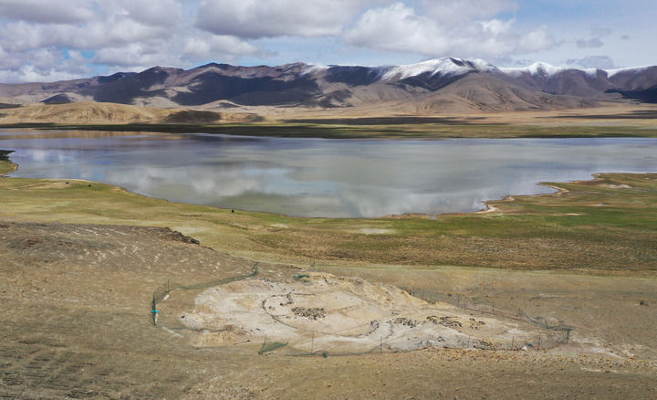 這是2025年5月22日拍攝的坐落在瑪不錯湖畔的遺址第四期石構(gòu)地面建筑考古發(fā)掘現(xiàn)場(無人機(jī)照片)。新華社記者 李賀 攝