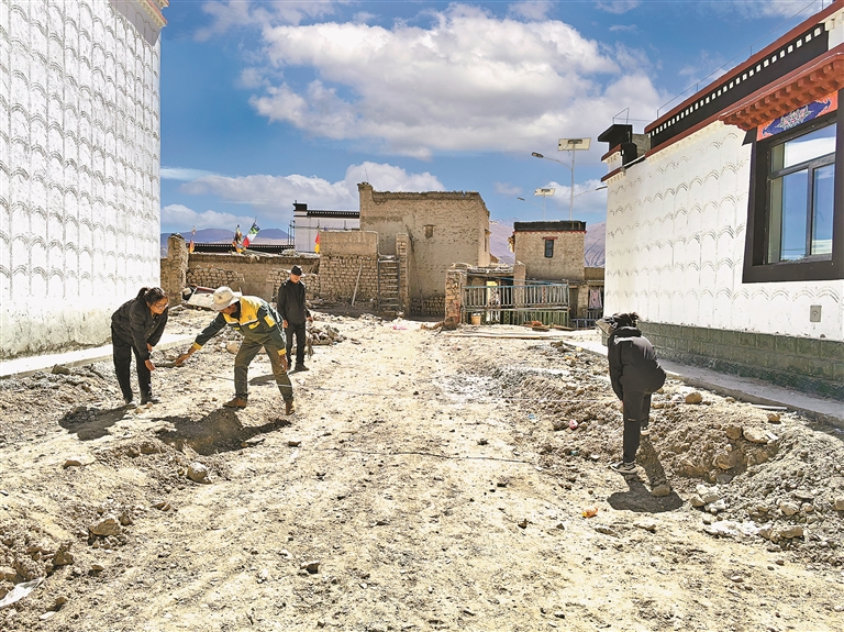 拉孜縣查務(wù)鄉(xiāng)那布西村干部、駐村工作隊隊員測量重建后的村道距離,初步確定群眾圍墻修建范圍。