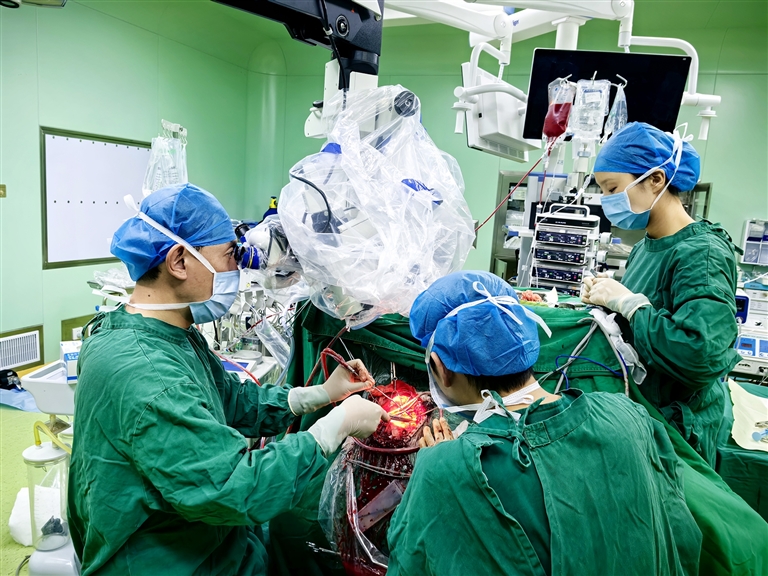 手術當日,在麻醉科和手術室護士團隊的密切配合下,由郝強主刀,單永炳、付永鵬擔任助手,為患者實施了手術。術中,郝強在顯微鏡下仔細分離腫瘤周邊的重要血管,最大程度保護周邊腦組織不受損傷,如同在生命禁區(qū)里仔細操作。術中一次性完整切除位于不同腦葉的3枚腫瘤,由于腦膜上散在多枚微小腦膜瘤,遂將侵犯腦膜一同切除。手術過程順利,患者恢復良好。術后復查頭顱MRI顯示,顱內(nèi)腫瘤已完全消失,無殘留。目前患者積極康復治療,將擇期出院。