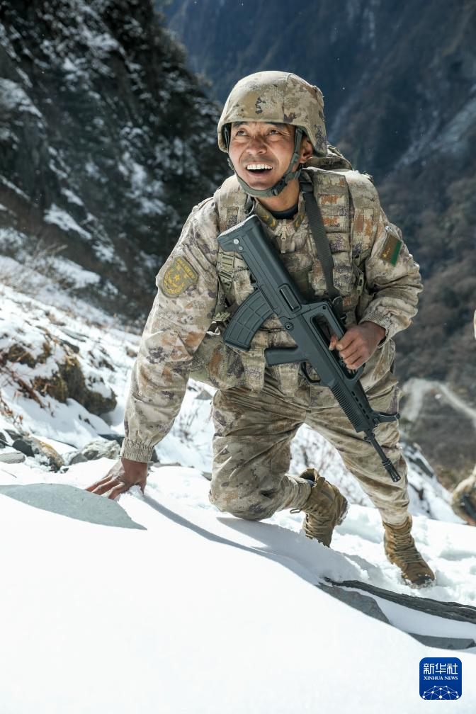 2024年1月5日,巡邏途中,西藏軍區(qū)某團(tuán)一級上士次羅布和戰(zhàn)友們翻越雪山。新華社發(fā)(張照杰 攝)