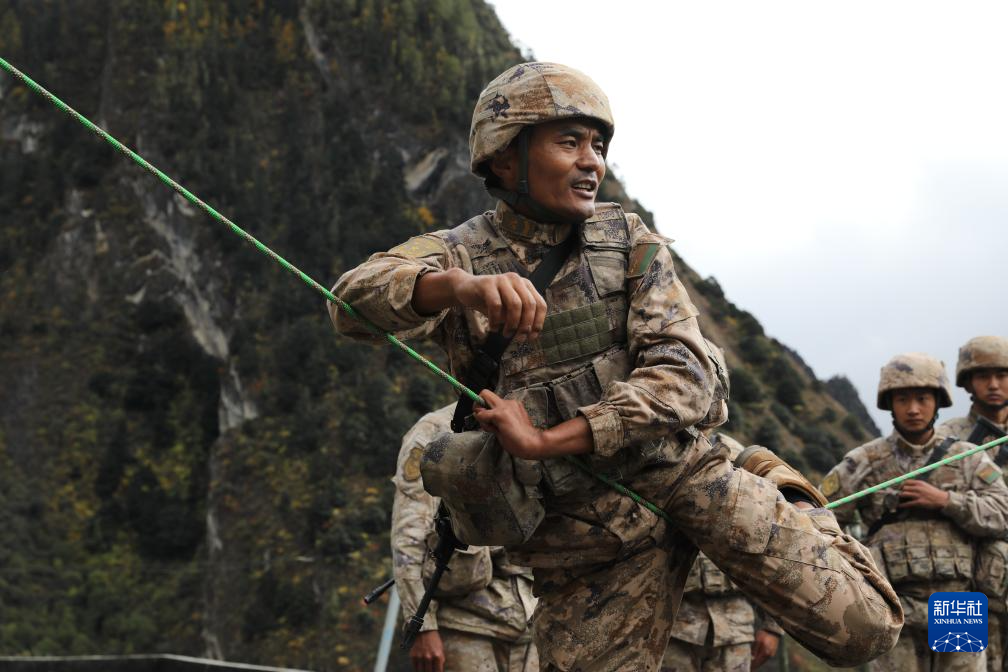 2025年11月1日,西藏軍區(qū)某團(tuán)一級上士次羅布給戰(zhàn)友示范戰(zhàn)術(shù)動作。新華社發(fā)(于達(dá) 攝)