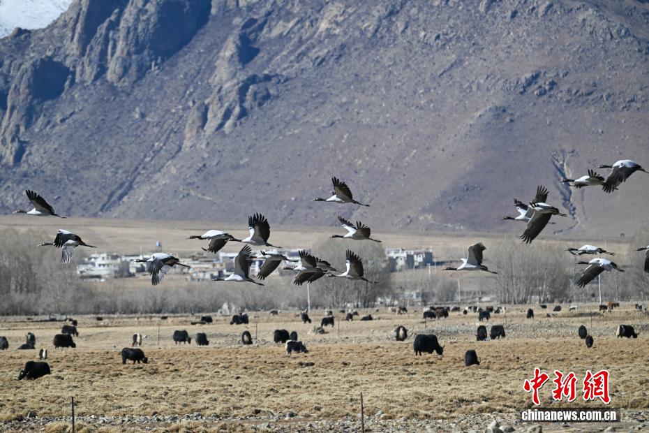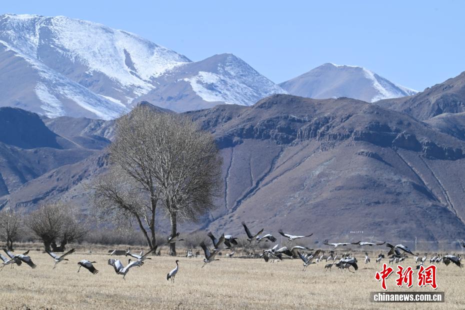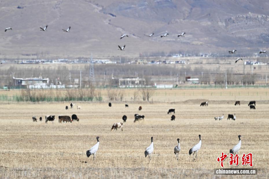 11月26日,位于西藏自治區(qū)拉薩市林周縣的黑頸鶴自然保護(hù)區(qū)內(nèi),大量越冬的黑頸鶴在卡孜水庫(kù)、農(nóng)田、濕地里覓食、嬉戲。林周縣位于拉薩河上游及澎波河流域,是黑頸鶴的主要越冬地之一。中新社記者 貢嘎來(lái)松 攝