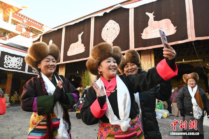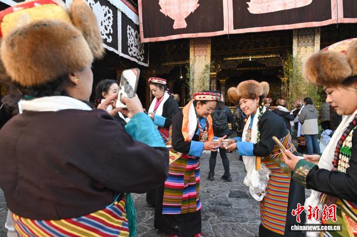 隨著藏歷十月十五白拉姆節(jié)(又稱“仙女節(jié)”)臨近,11月28日,西藏拉薩的婦女們在大昭寺跳完傳統(tǒng)舞蹈后自拍留念,迎接“仙女節(jié)”到來。“仙女節(jié)”即吉祥天母節(jié),藏語稱“白來日追”。相傳藏傳佛教最高護法神之一班丹拉姆的女兒白拉姆,不顧母親的反對與赤尊贊私定終身,班丹拉姆一怒之下將赤尊贊趕到拉薩河南岸,規(guī)定二人僅每年的藏歷十月十五日相見。中新社記者 貢嘎來松 攝