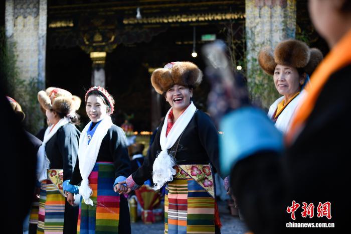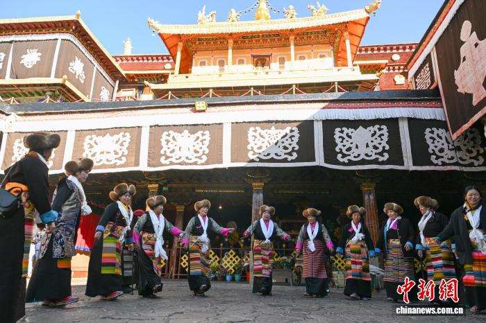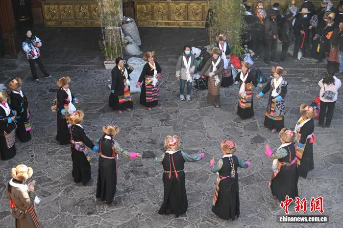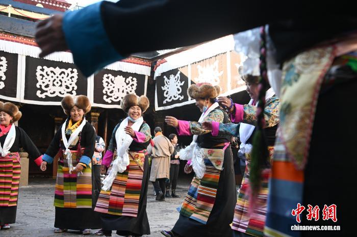隨著藏歷十月十五白拉姆節(jié)(又稱“仙女節(jié)”)臨近,11月28日,西藏拉薩的婦女們在大昭寺跳完傳統(tǒng)舞蹈后休息,迎接“仙女節(jié)”到來?!跋膳?jié)”即吉祥天母節(jié),藏語稱“白來日追”。相傳藏傳佛教最高護法神之一班丹拉姆的女兒白拉姆,不顧母親的反對與赤尊贊私定終身,班丹拉姆一怒之下將赤尊贊趕到拉薩河南岸,規(guī)定二人僅每年的藏歷十月十五日相見。中新社記者 貢嘎來松 攝