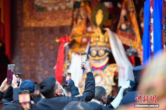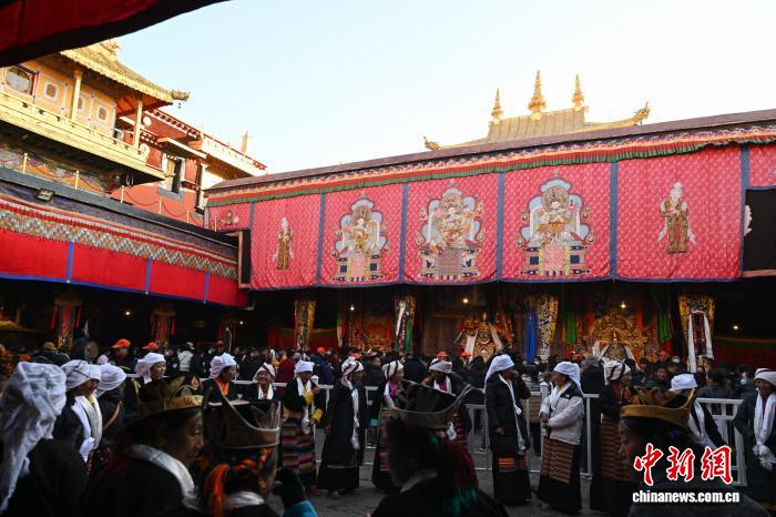 12月4日即藏歷十月十五日是藏族傳統(tǒng)的節(jié)日“白來日追”,俗稱“仙女節(jié)”、“白拉姆節(jié)”等。相傳藏傳佛教最高護法神之一班丹拉姆的女兒白拉姆,不顧母親的反對與赤尊贊私定終身,班丹拉姆一怒之下將赤尊贊趕到拉薩河南岸,規(guī)定二人僅每年的藏歷十月十五日相見。圖為信眾在大昭寺朝拜白拉姆像。中新社記者 貢嘎來松 攝