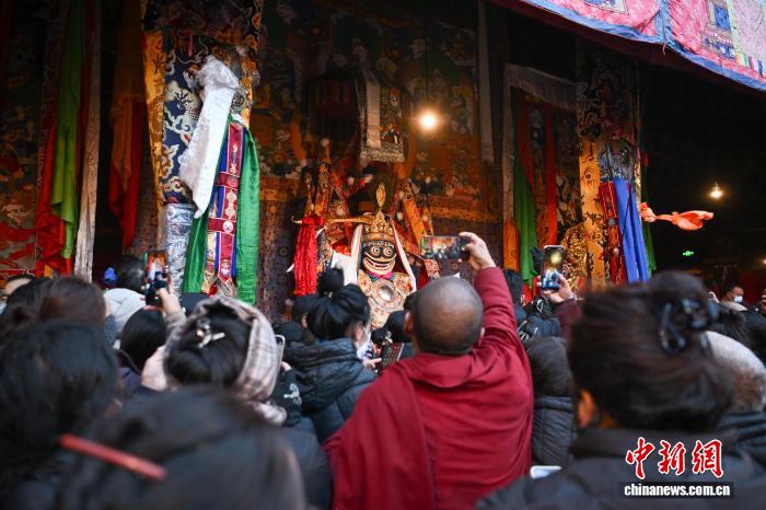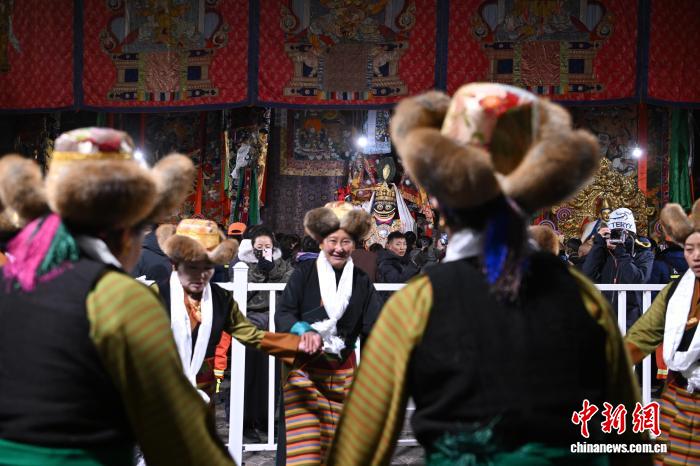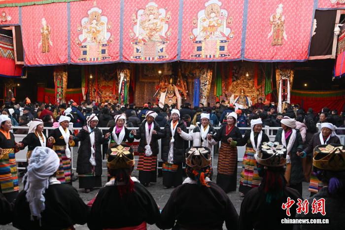 圖為身著民族服裝的信眾在大昭寺內(nèi)載歌載舞。中新社記者 貢嘎來松 攝