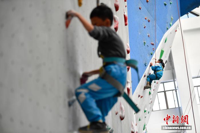 圖為拉薩市實(shí)驗(yàn)小學(xué)的學(xué)生在學(xué)習(xí)攀巖。中新社記者 貢嘎來松 攝