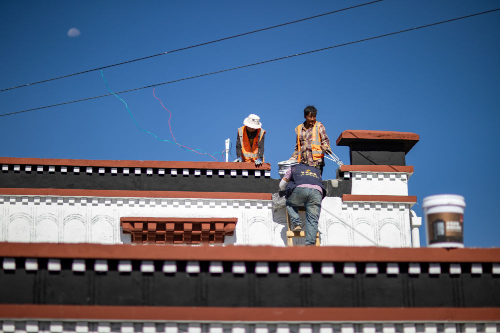 2025年8月11日,定日縣曲洛鄉(xiāng)措昂村彩繪工匠扎西、旦增貢加、拉巴在工作現(xiàn)場。他們都是本村受災(zāi)群眾,通過參與新房建設(shè)獲得勞動報酬。