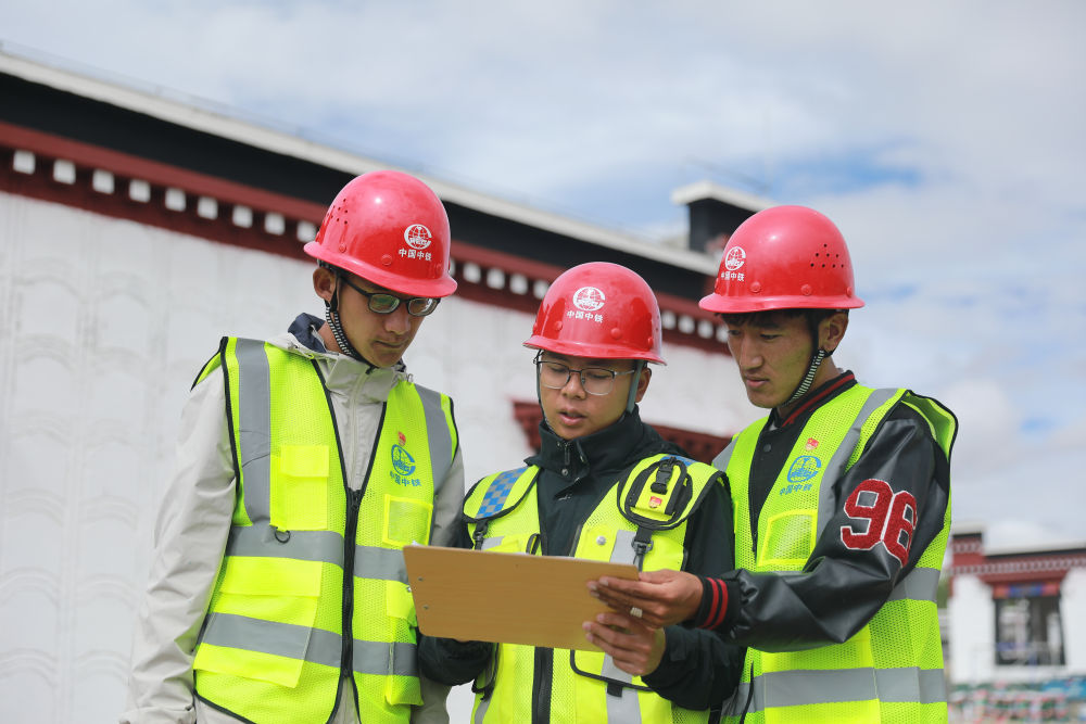 2025年8月10日,技術(shù)人員在中國中鐵定日縣曲洛鄉(xiāng)措昂村民房恢復(fù)重建項目施工現(xiàn)場商討方案。