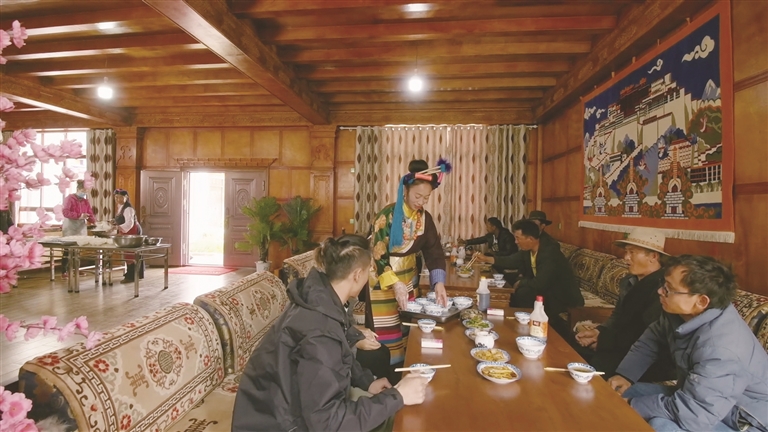 作為自治區(qū)級(jí)非遺傳承人、芒康縣“婦女致富帶頭人”的卓瑪拉姆,于2010年開辦鹽井果拉叢農(nóng)家樂(lè),憑借著正宗的加加面風(fēng)味和熱情的服務(wù),逐漸積累了口碑。2012年,在各級(jí)政府的支持下,她采用“民族特色餐飲+鄉(xiāng)村旅游接待”的經(jīng)營(yíng)模式,生意日益紅火。2017年,通過(guò)貸款300萬(wàn)元、自籌160萬(wàn)元翻建了農(nóng)家樂(lè),將其升級(jí)為綜合型的民族特色餐飲店,經(jīng)營(yíng)規(guī)模大幅擴(kuò)大,最多時(shí)日接待游客達(dá)300余人。