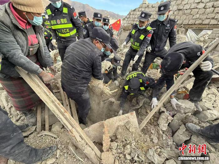 圖為定日地震發(fā)生后民警救援村民被埋的羊羔。日喀則邊境管理支隊供圖