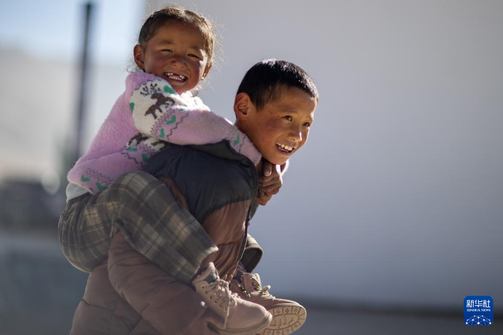 1月5日,在定日縣長(zhǎng)所鄉(xiāng)森嘎村村史館前的廣場(chǎng)上,小朋友背著妹妹玩耍。新華社記者 姜帆 攝