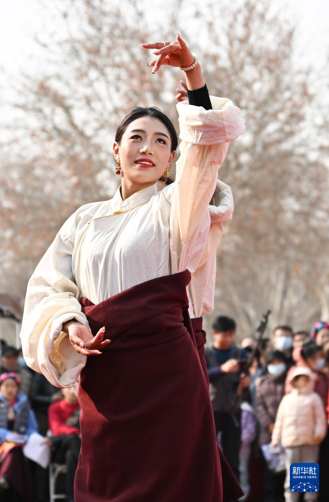 1月17日,來自西藏自治區(qū)昌都市基層文藝團(tuán)體的演員在西安大明宮國(guó)家遺址公園表演舞蹈。