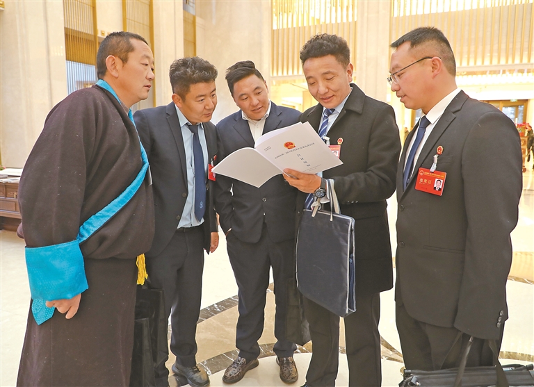 圖為山南市人大代表一起了解會議議程。