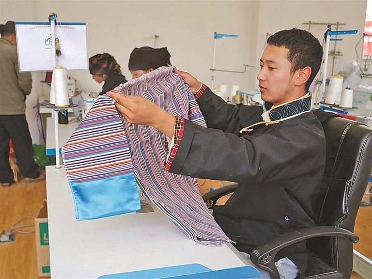 技藝的創(chuàng)新與市場的拓展,也為家鄉(xiāng)的農(nóng)牧民群眾帶來了實實在在的收益。始終心系群眾的米瑪堅才,系統(tǒng)培訓了18名農(nóng)牧民,使他們從零基礎(chǔ)慢慢成長為熟練掌握藏戲服飾制作技藝的手工藝人,不用背井離鄉(xiāng)就能在家門口掙錢?!耙郧翱糠N地過日子,收入不穩(wěn)定,現(xiàn)在在合作社有固定收入,一年下來能掙3萬多元,顧家掙錢兩不誤,特別知足?!焙献魃绲霓r(nóng)牧民員工談起這份工作,臉上滿是笑意。