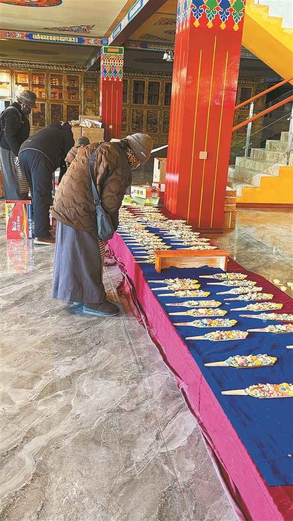 令人驚喜的是,現(xiàn)場有師傅正在制作酥油花。1月的拉薩寒意正濃,而制作酥油花卻需反復將雙手浸入冰水中塑形。冰水刺骨,但師傅們手下絲毫不見敷衍,每一片花瓣、每一道紋路都細致精巧。