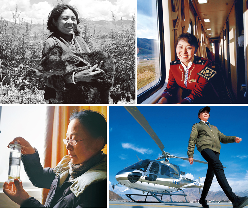 60多年來,西藏各族人民的生活條件全面改善,幸福指數(shù)大幅提升。左上圖:1959年,翻身農(nóng)奴卓瑪?shù)谝淮畏值綄儆谧约旱男∨伲ㄐ氯A社記者 李長永/攝)。左下圖:2019年2月28日,研究牦牛的藏族女博士姬秋梅在西藏自治區(qū)農(nóng)科院畜科所查看實(shí)驗(yàn)樣本(新華社記者 普布扎西/攝)。右上圖:2007年9月28日,青藏鐵路線上的首位藏族女列車長索朗德吉(新華社記者 覺果/攝)。右下圖:2019年3月20日,來自當(dāng)雄草原的藏族女直升機(jī)駕駛員益西(新華社記者 晉美多吉/攝)。