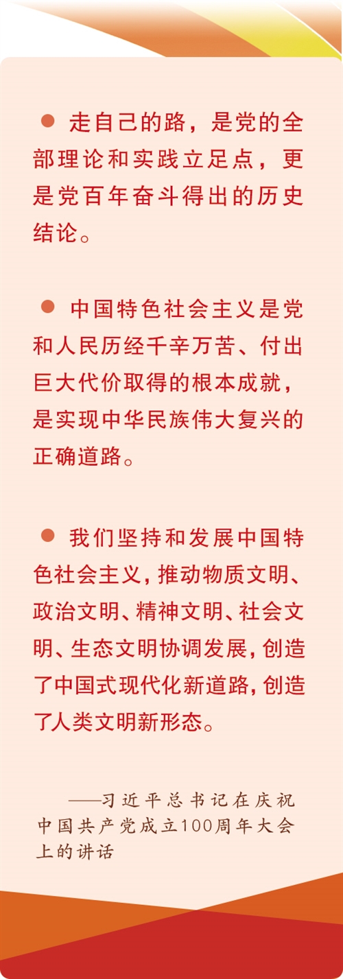 習(xí)近平總書記在慶祝中國(guó)共產(chǎn)黨成立100周年大會(huì)上強(qiáng)調(diào),“以史為鑒、開創(chuàng)未來(lái),必須堅(jiān)持和發(fā)展中國(guó)特色社會(huì)主義”“我們堅(jiān)持和發(fā)展中國(guó)特色社會(huì)主義,推動(dòng)物質(zhì)文明、政治文明、精神文明、社會(huì)文明、生態(tài)文明協(xié)調(diào)發(fā)展,創(chuàng)造了中國(guó)式現(xiàn)代化新道路,創(chuàng)造了人類文明新形態(tài)”。