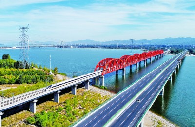 一列動(dòng)車組列車從河北省懷來(lái)縣境內(nèi)的京張高鐵跨官?gòu)d水庫(kù)特大橋上通過(guò)。新華社發(fā)