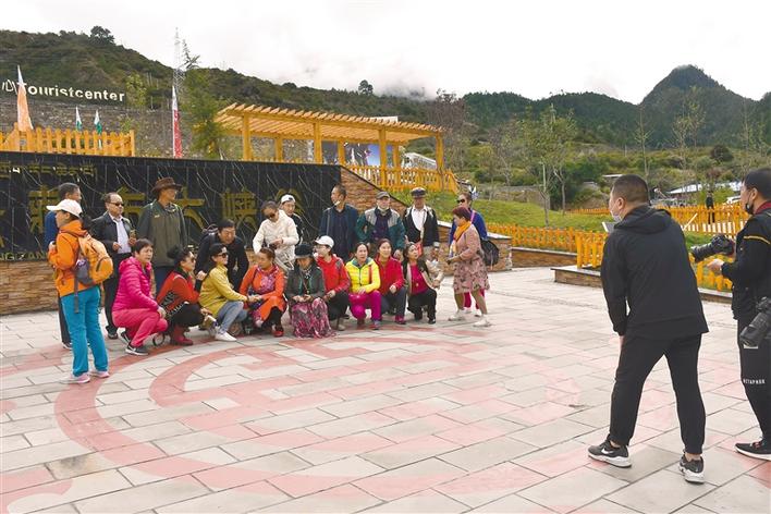 圖為來(lái)自四川的旅行團(tuán)在大峽谷景區(qū)門(mén)口合影。本報(bào)記者 張猛 胡文 攝