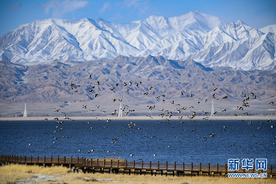 天光云影,百鳥翔集,一群赤麻鴨在都蘭湖國家濕地公園上空飛翔。(11月21日攝)新華網(wǎng) 潘彬彬攝