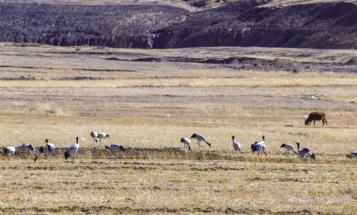 遠遠望去,只見高頸長腿的黑頸鶴一邊覓食、一邊梳理羽毛,悠然自得。如果耐心一點在田間蹲守,不時還可以看到成群的黑頸鶴飛翔于冬日的藍天下,姿態(tài)優(yōu)美地盤旋,尋找合適的田間落下。旦增說,它們要覓食至傍晚時分,才成群結(jié)隊飛回虎頭山水庫。