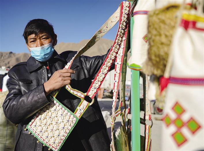“這個(gè)小包好精致,太好看了。”旦增的攤前圍繞著一群人?!澳莻€(gè)最小號(hào)的包還有嗎?”“不好意思,都賣完了,您看看其他型號(hào)的吧?!眮?lái)自林芝市朗縣的旦增已經(jīng)是第四次參加物資交流會(huì)了,此次物資交流會(huì)他不僅帶來(lái)了核桃、辣椒、蘋果等當(dāng)?shù)靥厣a(chǎn)品,還帶來(lái)了牦牛皮制作的手工包。