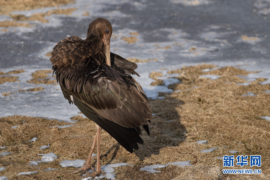 12月6日,一只黑鸛在西寧市北川河濕地公園內(nèi)整理羽毛。新華社記者 吳剛 攝