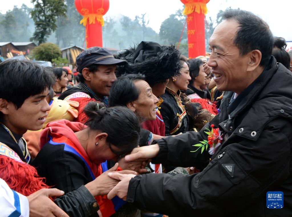 2013年10月31日,墨脫縣通車,當(dāng)?shù)厝罕姼兄x建設(shè)者。墨脫公路于10月31日正式通車,這標(biāo)志著墨脫將正式擺脫“全國唯一不通公路縣”的歷史。新華社記者 覺果 攝