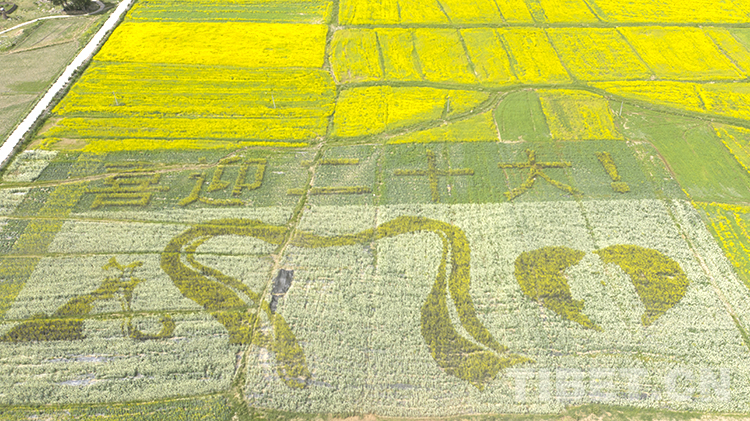 值得一提的是,在扎西崗鄉(xiāng)主會場,當?shù)貙⒒牡刂匦麻_墾,安排種植了油菜花大地景觀。不同品種、不同顏色的油菜花海為背景的種植,從空中俯瞰形成了“喜迎二十大”“松贊故里 幸福墨竹”字樣和松贊干布、文成公主、哈達、愛心等圖樣,表達當?shù)厝罕娤灿h的二十大的美好祝福。