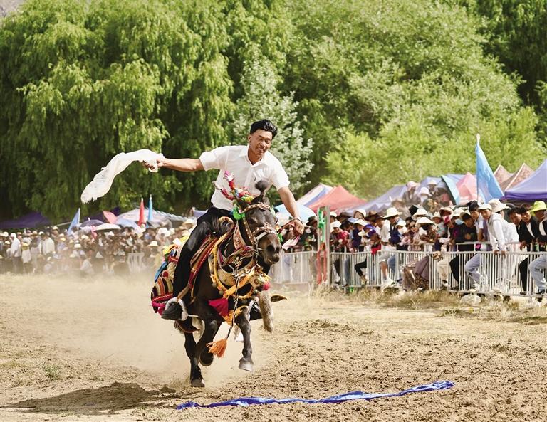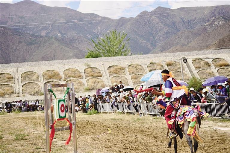 當日上午11時,茶巴朗村望果節(jié)賽馬正式開始,騎手們身著傳統(tǒng)服飾,戴著紅纓帽,身背彎弓,騎著打扮華麗的駿馬,進行了4000米速度賽馬、拾哈達、射箭、馬術(shù)等精彩比賽?,F(xiàn)場,觀眾揮舞手臂為選手們鼓勁吶喊。馳騁在賽場上,選手的吆喝聲伴著觀眾的吶喊聲在賽場上空匯聚。