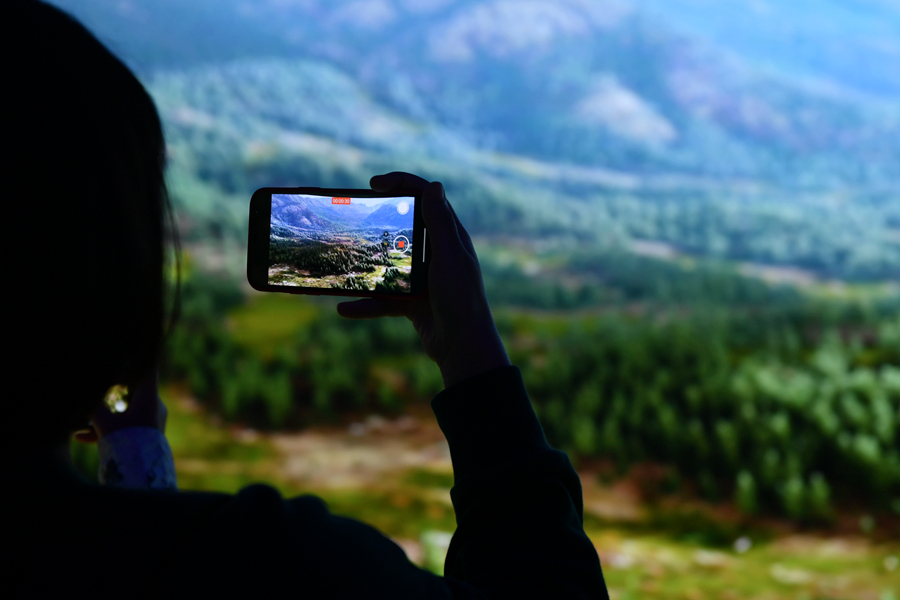 參觀者在祁連山國家公園青海片區(qū)展陳中心內的球幕影院拍攝。