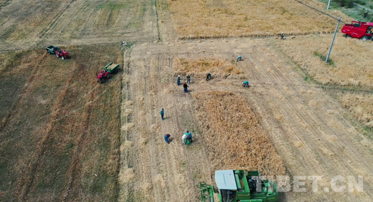 在達孜區(qū)雪鄉(xiāng)扎西崗村,隨著機器轟鳴,一顆顆金色飽滿的青稞粒構成一扇彩虹門,有人在曬青稞、有人在裝袋、有人在搬運,一幅和諧的秋收圖展現(xiàn)在眼前?! ?/p>