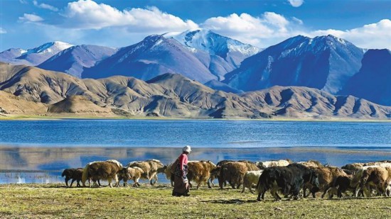 圖為阿里地區(qū)日土縣牧民在班公湖邊悠閑地放牧。 格桑塔杰 攝