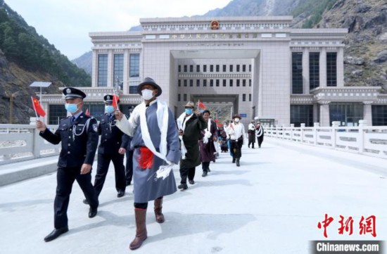 吉隆出入境邊防檢查站移民管理警察帶領(lǐng)退休干部參觀新建熱索大橋?!⌒じ毁F 攝