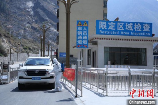 吉隆出入境邊防檢查站移民管理警察對外出口岸限定區(qū)域車輛進行消毒?!⌒じ毁F 攝