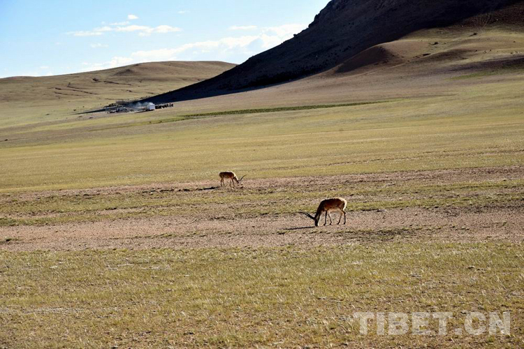 圖為羌塘草原上與牧民和諧相處的藏羚羊(2022年7月攝) 攝影:彭萍
