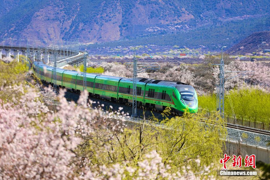 近日,中國鐵路青藏集團(tuán)有限公司介紹,3月下旬至4月,拉林鐵路沿線綿延的野生桃花林盛開,藍(lán)天、白云、桃花、雪山、高原復(fù)興號動車等相互交織,形成了一幅幅美不勝收的畫面。圖為穿梭在桃花林中的拉林鐵路高原復(fù)興號。