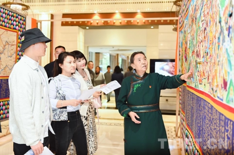 圖為格日勒老人(右)向嘉賓介紹“倉央嘉措馬鬃繞線長(zhǎng)卷故事唐卡”