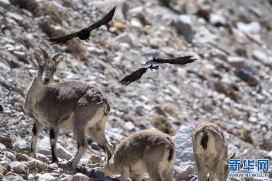 5月9日,在珠穆朗瑪峰登山大本營附近拍攝的黃嘴山鴉與巖羊。新華網(wǎng) 旦增努布 攝
