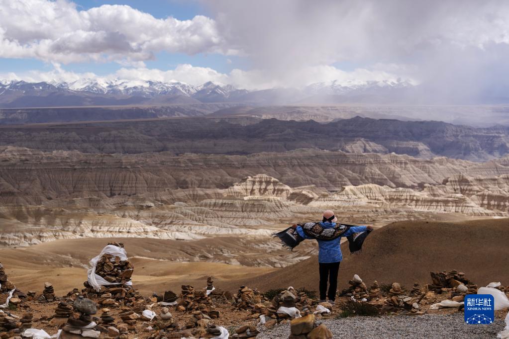 游客在札達(dá)土林留影(5月25日攝)。新華社記者 費(fèi)茂華 攝