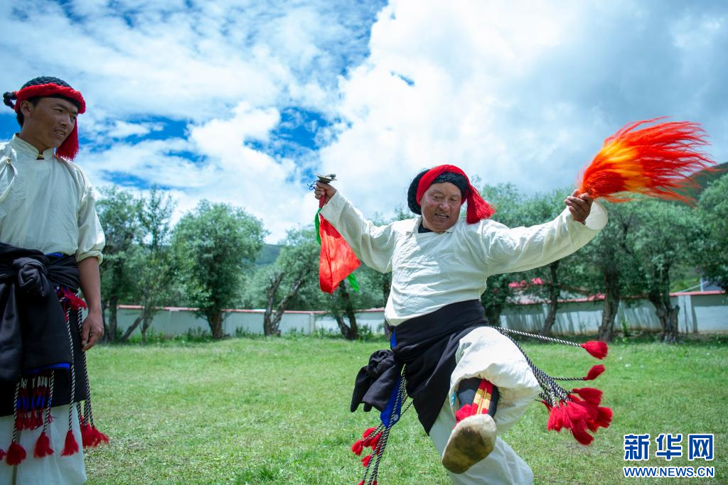7月12日,西藏昌都市丁青縣尺犢鎮(zhèn)烏巴村文藝演出隊隊員在排練。 新華網(wǎng) 旦增努布 攝