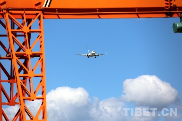 圖為一架西藏航空旗下的飛機從開工儀式現(xiàn)場上空飛過 攝影:王佳豪